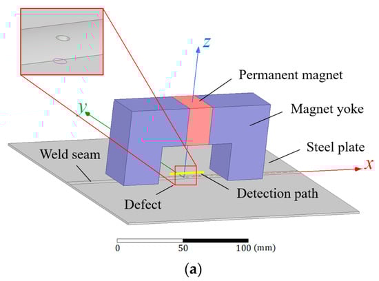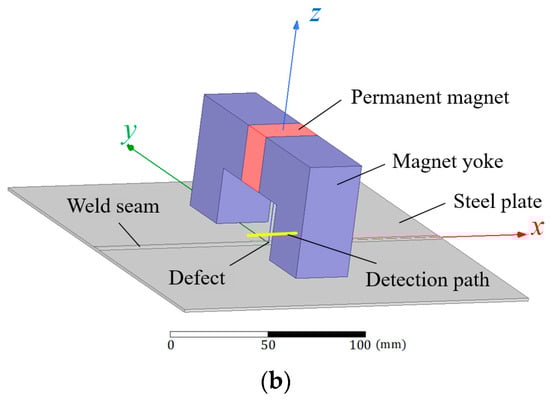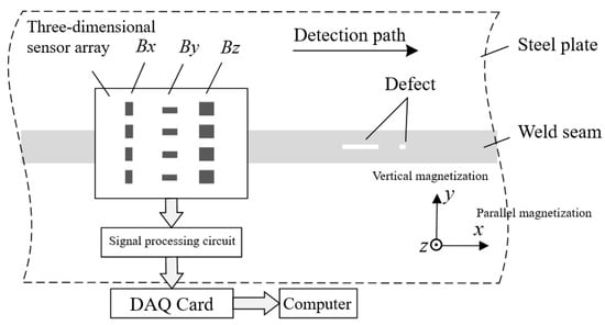 The MFL detection technique is a non-destructive method based on the changes of magnetic permeability at the location of defects in magnetized objects. A magnetic sensor is used to detect the flux leakage field at the position of the defects. This method has a few advantages, including high detection accuracy, quick detection speed, a straightforward structure, and no requirement for coupling agents. It is particularly effective for detecting surface and near-surface defects in ferromagnetic materials [3,4]. During MFL detection of pipeline circumferential welds, the detector is usually placed inside the pipeline and is oriented perpendicular to the weld for optimal detection [4]. For the automated online detection of sheet steel welds, detecting along the welding direction can improve detection efficiency and resolve issues associated with sudden changes in lift-off values when detecting perpendicularly oriented welds, which can cause distorted leakage magnetic signals.