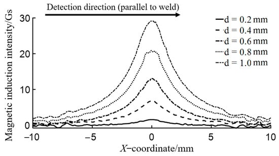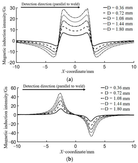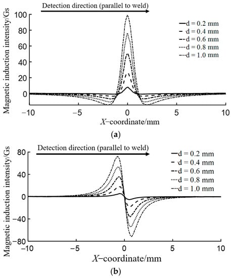 When the weld is magnetized in the parallel direction, the magnetic field distribution is akin to that of a flat surface material. In contrast, magnetization of the weld in the perpendicular direction leads to “bumps” on the magnetization path and a reduction in magnetic resistance at that location. This decrease results in a decline of the flux leakage field above the weld. To obtain the flux leakage field caused by defects, the flux leakage field components should be subtracted from the corresponding magnetic field components, without defects ( or ), for quantitative analysis.