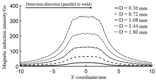 For rectangular groove defects with a fixed length of 5 mm and a width of 0.5 mm, researchers in this study conducted simulations for defects of varying depths to calculate the magnetic induction intensity at the detection line position. The depth D is set to 0.36, 0.72, 1.08, 1.44, and 1.80 mm (20%t, 40%t, 60%t, 80%t, and 100%t), respectively, based on the weld thickness (sheet thickness + weld reinforcement height) t = 1.8 mm. The flux leakage field of the defect at the detection line position is calculated using Equation (2).