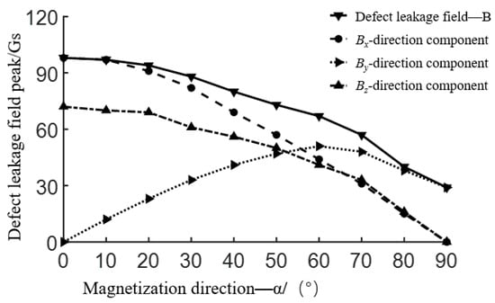 To confirm the above conclusion, a simulation calculation of the peak variation of the flux leakage and its components is performed for magnetic direction angles ranging from 0° to 90° (with a 10° interval) and for a circular hole defect with a diameter of 1 mm and a depth of 1.8 mm, as shown in Figure 10.