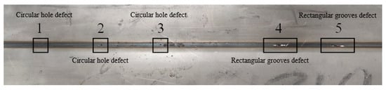 A 43 array of Hall sensors, with 4 sensors in each direction, makes up the sensor (x, y, and z). Since there are 4 mm between sensors in the same direction, a 12 mm scanning width is possible, guaranteeing comprehensive coverage of the weld. The sensor array is positioned near the weld’s center during the detection procedure, with a lift-off distance of 1 mm. The scan is carried out along the direction of the weld at a speed of around 0.3 m/s. The identical detection settings are used for all tests, and both x-direction (parallel to the weld) and y-direction (perpendicular to the weld) studies are carried out. The chosen sheet is built from Q235 material. It has dimensions of 600 mm × 500 mm × 1 mm, a weld width of 6 mm, and 5 simulated faults are positioned at the weld centerline. Figure 13 displays the sheet weld defect samples, and Table 2 displays the defect size parameters. The labeled numbers in the figure match the defect numbers.
