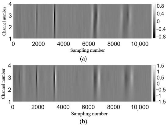 Grayscale image of the MFL signal in the direction of parallel magnetization. (a) MFL signal of component; (b) MFL signal of component.