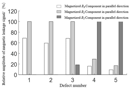 The peak values of the flux leakage field components for defects with various dimension in Figure 4 and Figure 5, are compared in Figure 6 as follows. The comparison is drawn between the two magnetization directions. As the diameter of the circular hole defect increases, the amplitude of the component gradually increases. Furthermore, the and components of the parallel magnetization field are greater than the component of the perpendicular magnetization field. The flux leakage field induced by parallel magnetization is therefore stronger than that excited by perpendicular magnetization for circular hole defects of the same size.