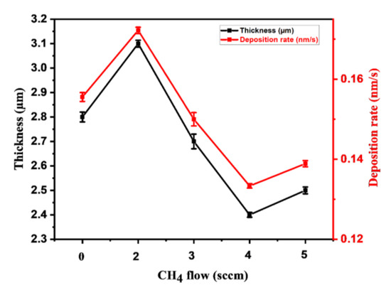 Figure 1 shows the variation of the thickness and deposition rate versus the CH4 gas flow.
