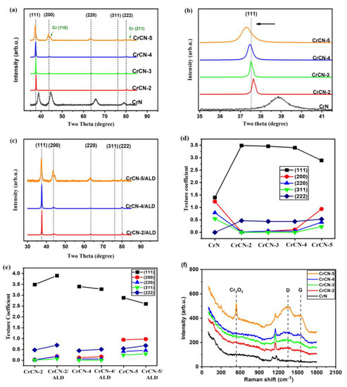 XRD diffractograms and texture coefficient variations of (a,b,d) CrN, CrCN-2, to CrCN-5 and (c,e) CrCN/ALD duplex coatings. (f) Raman spectra of CrN and CrCN-2 to CrCN-5 coatings.