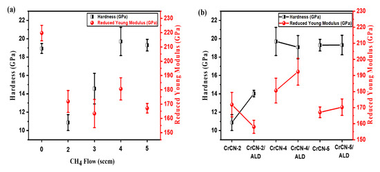 Hardness and reduced Young’s modulus: (a) as a function of CH4 flow rate and (b) for different coatings.