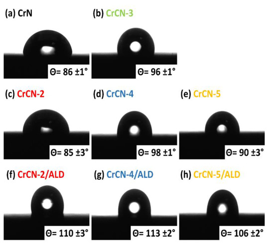 Water contact angles of (a) CrN; (b) CrCN-3; (c) CrCN-2; (d) CrN-4; (e) CrCN-5; (f) CrCN-2/ALD; (g) CrCN-4/ALD; and (h) CrCN-5/ALD coatings.