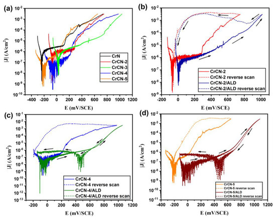 For further investigation, and in order to enhance the stability of the passive film in the CrCN-4 and CrCN-5 coating while maintaining the benefit of their low corrosion densities, the Al2O3-ZnO ALD nanolaminates were deposited as sealing layers. The corrosion polarization plots with a reverse scan of the CrCN-2/ALD, CrCN-4/ALD, and the CrCN-5/ALD are plotted in Figure 7b–d, respectively.