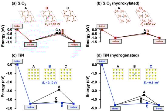 Diffusion energy diagrams of Ru atoms for each substrate: (a) SiO2; (b) hydroxylated SiO2; (c) TiN; (d) hydrogenated TiN. The most favorable surface diffusion path with its activation energy is highlighted in color for each substrate.