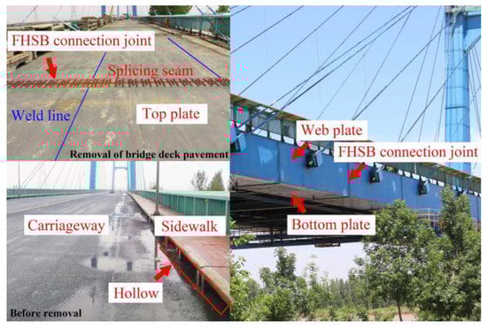 The Shengli Yellow River Bridge is the first cable-stayed bridge with a steel box girder and orthogonal special-shaped plates built in China. Located in Kenli County, Dongying City, the bridge was completed and opened to traffic in October 1987. With a main bridge span of (60.5 + 136.5 + 288 + 136.5 + 60.5) m, the main beam has 57 steel box sections and 56 transverse joints in total. Its cross-section is a separated double-sided rectangular box. Six orthotropic bridge decks are symmetrically arranged in the middle of the cross-section, with two in upstream and downstream box girders, respectively, and four between the box girders. The top and bottom plates are U-shaped closed ribbed orthotropic plates, most of which are 12 mm thick. Figure 1 shows the schematic diagram of FHSB connection nodes for transverse joints. The transverse joint nodes of the whole bridge are connected by more than 110,000 sets of 10.9 M22 FHSB, and the diameter of the bolt opening is 24.5 mm. The seam between the steel box sections is 6 mm wide, and the splice plate is 10 mm thick. The design value of the friction coefficient of the aluminum spraying contact surface is 0.45, and the longitudinal joint connection is field groove welding. The pavement is composed of an epoxy resin coal tar anti-skid layer, a 40 mm bottom layer, and a 30 mm surface layer of rubber asphalt. Figure 2 shows the schematic diagram of the components of the FHSB connection node.