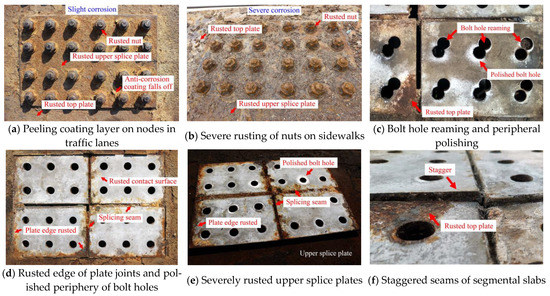 Figure 3 displays some typical diseases of the transverse joint FHSB connection node. Due to exposure of the top plate of the box girder at the lower-part sidewalk and cracking of the pavement, the nodes were corroded by rain and corrosive gas year-round, resulting in severe corrosion of the nodes, with some nut thicknesses reduced by up to 65%. In addition, the longitudinal ribs of the top and bottom plates at the FHSB nodes of the transverse joints had open butt welds, severely weakening the rigidity of the bridge deck, and resulting in different polishing degrees among the joint connecting components. The primary diseases of FHSB connection nodes of transverse joints included coating peeling, corrosion of connection components, and polishing of section plate joints and bolt holes. Investigation and analysis found that 9.62% of bolt holes were not expanded according to specifications. Some gusset plate bolt holes were polished around, generally in a circle of the varying area with an average diameter of 11 mm. Polished bolt holes accounted for 15.22% of the total. Construction quality issues such as nonstandard hole expansion, staggered slab joints, and contact surface pollution led to poor tightness of FHSB connection joint contact surfaces, accelerating corrosion of joint contact surfaces.