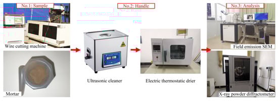 The instruments utilized in this analysis included a ZEISS SIGMA 500 field emission scanning electron microscope (SEM) from ZEISS, Oberkochen, Germany, which was used to observe the surface morphology of the samples and analyze the chemical composition of both the substrate and corrosion layer using energy spectrum. The material structure of the corrosion products was analyzed using a German D8 ADVANCE A25 X-ray powder diffractometer, Bruker, Billerica, MA, USA. The powdery substances were ground into a fine powder of less than 200 mesh in an agate mortar and placed on the sample tank for testing, while the measured surface of blocky substances was made as flat and smooth as possible to ensure that the sample could be loaded into the φ 25 mm × 3 mm sample tank. The wire-cutting machine used was a Hai DK7735 from Changwei, Jiangsu, China, with an average cutting speed of 60–90 mm2/min. An ultrasonic cleaner (Model: Xinzhi-SB-5200DT, Xinzhi, Ningbo, China) with a power of 360 W was employed, along with an electric thermostatic drier (Model: Shangcheng-101, Shangcheng, Shaoxing, China) with a voltage/power of 220 V/500 W and a temperature range of 10–300 °C. The ZEISS SIGMA 500 field emission SEM had a resolution ratio of 0.8 nm@30 kV STEM, 0.8 nm@15 kV, 1.4 nm@1 kV, and a magnification range of 10–1,000,000×. The X-ray powder diffractometer used was a D8 ADVANCE A25 from Germany, with an angle measurement range of 10–90 degrees, a Cu target, and a scanning speed of 0.2/step [14,28]. Figure 5 shows a schematic diagram illustrating the experimental setup used in the study.