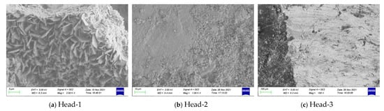 Figure 6 displays the microscopic morphology of the sample surfaces. SEM analysis found that the corrosion products on the surface of the bolt head (Head-1) were mostly scaly and loose. The corrosion products on Head-2 were mostly clastic, with a loose structure, smooth local areas, and obvious boundaries. Head-3 had a compact structure, smooth local areas, and obvious boundaries. The corrosion products of Nut-1 and Nut-2 were mainly needle-shaped, as well as scaly and spiky. The micromorphology of the gasket surface was basically similar to that of Head-2 and Head-3. The surface of Plate-1 aluminum spraying layer was uneven and in a dense granular shape, without visible rust. The surface of the Plate-2 and Plate-5 aluminum spray coating was slightly rusted and dark gray, with layered and cracked corrosion products. The Plate-6 aluminum spraying layer was severely rusted, smooth, porous, and had white powder and a loose surface structure. After the aluminum coating on the contact surface was completely corroded, and the steel plate substrate gradually rusted, the corrosion products of Plate-3 and Plate-4 were reddish-brown, mostly massive, and spherical with obvious cracks. The surface protective layer of Plate-7 and Plate-8 in contact with the atmosphere had basically fallen off, with clustered corrosion products on Plate-7’s surface and dense massive corrosion products on Plate-8’s surface, though with many cracks and obvious delamination.