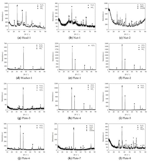 Figure 7 displays the XRD pattern of corrosion products on the sample surfaces. Analysis results showed that the corrosion products of the bolt head, nut, gasket, and outer surface of the steel plate were primarily iron and silicon oxides. Additionally, the corrosion products of Head-1 contained FeS. Those of Nut-1 and Nut-2 contained MnO2 and FeOOH. Those of Plate-7 and Plate-8 contained Mn2O3 and FeOOH. The corrosion products of the steel plate contact surface samples were primarily aluminum and iron oxides, mostly Al2O3, Fe2O3, and Fe3O4.