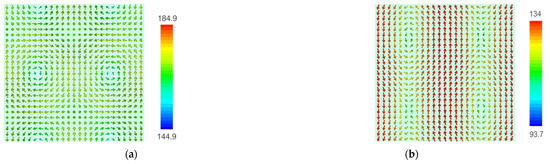 (a) Electric dipole (V/m) and (b) Magnetic dipole (A/m) at wavelengths of 319.78 nm (first resonance wavelength) and 368.3 nm (second resonant wavelength), respectively. The scales represent values in decibels. The views relate to the x-y plane.
