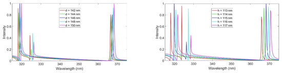 The following values have been used for the sensor parameters shown in Figure 1a: P = 340 nm, H = 100 nm, d = 150 nm and h = 15 nm. It is important to understand how the parameter variations of the unit cell may affect the sensor performance. For this purpose, slight variations of the metasurface parameters have been investigated. The effects of the variations on the targeted ultraviolet spectral responses have been recorded in Figure 3. The analysis reveals that the sensor is tolerant of minor variations that may occur during the fabrication process, but large variations adversely affect the performance of the structure.