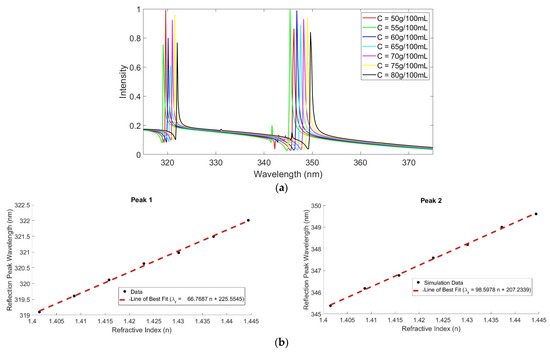 (a) Biosensor response to changing refractive indices. (b) Regression analysis of the two resonance peaks.