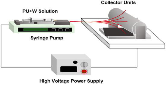 N-dimethylformamide (DMF, 99.5%, Daejung, Siheung-si, Republic of Korea) was used as a solvent for polymer dissolution. Thus, two solvents were used to prepare the spinning solution, and chloroform (95%, Duksan, Ansan-si, Republic of Korea) was used as a powerful solvent to control the volatilization rate of the solvent and DMF for polymer dissolution. The spinning solution was mixed at 600 rpm using a magnetic stirrer (Laboratory stirrer/hot plate, PC-420, Corning, Reynosa, Mexico) after dispersing for 1 min with an ultrasonic mill after adding 5.165 g of DMF and 2.785 g of chloroform. In addition, 2.05 g of PU was added, and the speed was reduced to 220 rpm after 10 min. Subsequently, the mixture was mixed for more than 12 h to completely dissolve the polymer and then spun. To make a nanofiber pattern using the prepared spinning solution, electrospinning was implemented, as shown in Figure 1.