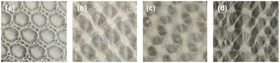 Surface image of dispersion pattern applied with polymer nanofibers (×500): (a) P1: honeycomb pattern; (b) P2: matrix pattern; (c) P3: double-circle pattern; (d) P4: spider web pattern.