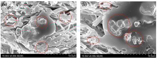 Cross-sectional image of electrospinning of nanofibers: (a) P1, honeycomb pattern, (b) P3, double-circle pattern; tungsten particle distribution in the red circles.