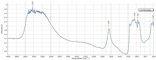 An FTIR spectrum of the Ca–Zn phosphate layer is shown in Figure 8. As can be seen, the vibration band between 600–700 cm−1 has a significant peak at 607 cm−1; this band can be assigned to the stretching vibration of hydroxyl groups or PO4−3 groups [35]. The O-H group can appear due to the motion of the absorbed water [36]. In addition, significant peaks are presented between 3100–3600 cm−1, which can also be attributed to O-H groups that can indicate the existence of crystal water [30]. This aspect is available also for the peak between 1500–1700 cm−1. The peak at 1041 cm−1 can be attributed to the PO4−3 group, which is part of all the identified phases from the XRD results. Furthermore, the peak at 964 cm−1 and the vibration band between 900–1200 cm−1 correspond to the P-O stretching in HPO42 [37].