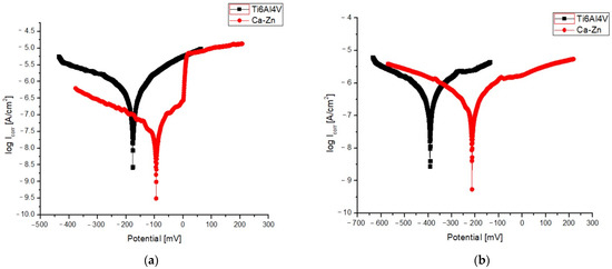 Figure 9 shows the potentiodynamic polarization curves of Ti6Al4V coated with a Ca–Zn phosphate layer (Ca–Zn) and Ti6Al4V uncoated samples, tested in Dulbecco solution (Figure 9a) or Ringer solution (Figure 9b). The corrosion parameters of Ecorr, Icorr, βa, βc, polarization resistance (Rp) and corrosion rate (CR) were calculated with formulas presented in a previous study [25] and are summarized in Table 2. In both cases, Ti6Al4V specimens were tested as control samples in order to reveal the influence of the coating on the corrosion properties of the titanium alloy.