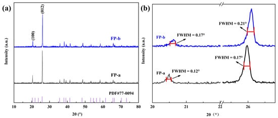 (a) XRD patterns of FP−a and FP−b; (b) Partial magnification of XRD for FP−a and FP−b.