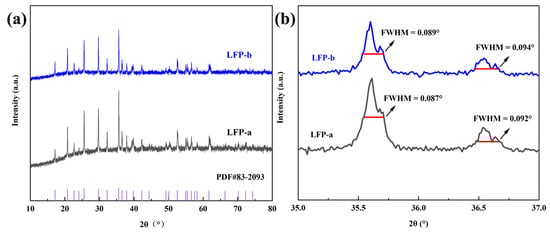 Then, the crystal structure of the sintered products of the two samples was detected as shown in Figure 3a. The diffraction peaks of the two LiFePO4 samples are in good agreement with PDF#83-2093, indicating that the crystal structure of the product belongs to the Pnma space group and is olivine structured LiFePO4. Pnma is an orthogonal crystal system with a centrosymmetric space group. In the Pnma notation, p denotes a simple lattice, n denotes an n-slip surface, m denotes a mirror surface and a denotes an a-slip surface. There are no obvious impurity diffraction peaks in both samples, but the diffraction peak intensity of LFP−b is slightly weaker. It can be seen from the locally amplified XRD pattern (Figure 3b) that compared with LFP−a, the FWHM of LFP−b is increased. And the FWHM is inversely proportional to the grain size. According to the Scherrer equation, the grain sizes of LFP−a and LFP−b are 111.1 and 92.7 nm, respectively.
