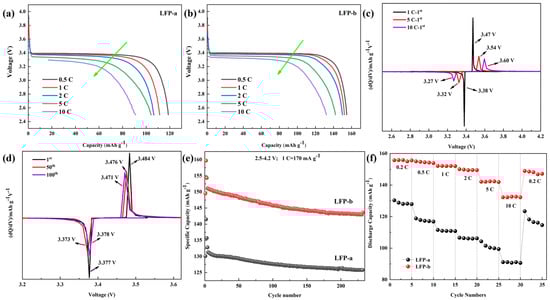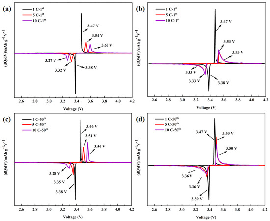 Differential curves of different periods of LFP−a and LFP−b at different rates in the voltage range of 2.5–4.2 V: (a,b) first cycle; (c,d) 50th cycle.