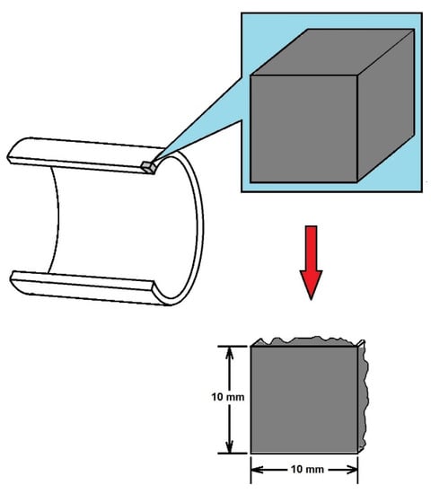 The experimental procedure began with steel sample preparation. First of all, from a half-round steel pipe, cubic samples (1 cm × 1 cm × 1 cm = 1 cm3) were mechanically cut. After this process, samples were mounted in acrylic blocks. The samples were ground using 240, 320, 400 and 600 grit papers initially and then fine-polished using an Al2O3 suspension. Figure 1 schematizes this process: