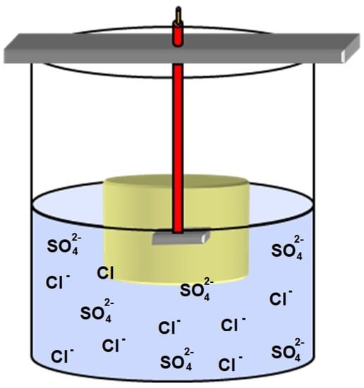 Immersion tests were carried out to study the relationship between non-metallic inclusions found in API 5L X60 steel and pit generation and growth. The chemical compositions of solutions used in the immersion tests were similar to those found in a soil corrosiveness study in Mexico [28]. The chemical content of the prepared chemical solution was 16.84 ppm SO4−2 and 289.5 ppm Cl−, and pH = 4.35 at room temperature. The immersion tests were carried out for two different periods of time. One battery of experiments was carried out over short periods of time (15, 30, 60, 180 and 360 min). In the other series of experiments, the immersion tests were accomplished after 1, 3 and 7 days. For illustration purposes, Figure 4 depicts the immersion test performed as part of the present work.