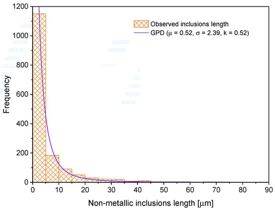 These three histograms (Figure 6, Figure 7 and Figure 8) were fitted to probability density functions (PDFs). The best choice was the PDF that satisfies the tests of Kolmogorov–Smirnov, Anderson–Darlin and chi-square. Regarding the random variable, inclusion length was fitted to a Generalized Pareto distribution (GPD). This function is represented by the mathematical expression indicated in Equation (3) [35].