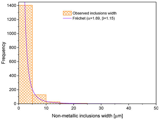 where , and are the parameters of location, scale and shape, respectively. Concerning the inclusion width histogram, it was fitted to the Fréchet distribution, which is represented by Equation (4) [36].