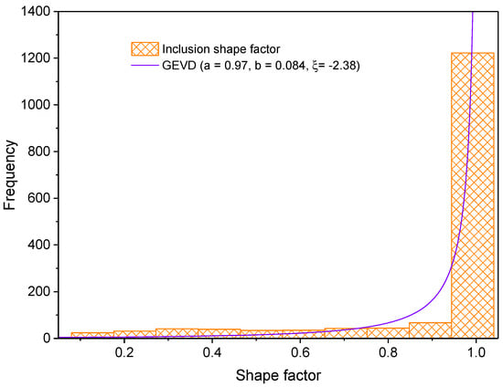 where and are the shape and scale parameters, respectively. The shape factor histogram was fitted to the Generalized Extreme Value distribution (GEVD) expressed by Equation (5) [36].
