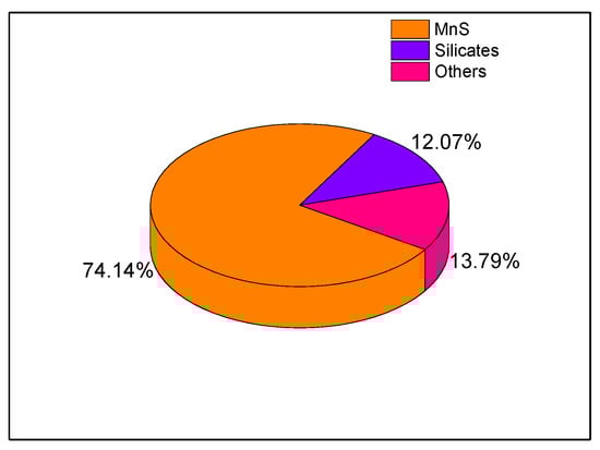 After EDS analysis of the studied non-metallic inclusions’ chemical composition, it was found that the vast majority of them were compounds of MnS (about 74%). Silicates were the second most frequent type of inclusions (mainly SiO2 and CaOSiO2), accounting for about 12% of the total. The remaining inclusions were compounds of Al2O3, 3CaO·Al2O3, CaO·Al2O3, CaO·2Al2O3, CaO·6Al2O3, FeSiC, FeSiO, AlCaO, AlMgCaO, etc. Figure 9 depicts the distributions of the non-metallic inclusions found.
