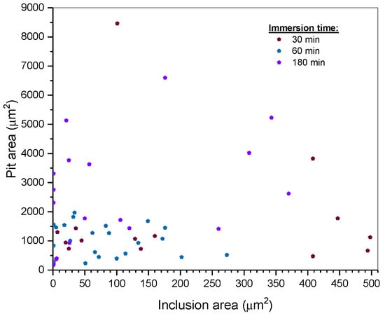 For the sake of finding a relationship between inclusion area and pitting area, we plotted a scatter diagram as shown in Figure 11. One can notice a greater correlation between inclusion area and pit area when the inclusion area is smaller than 200 µm2 (Spearman’s rho (correlation coefficient) equal to 0.50). The smaller the inclusion area is, the greater the probability of provoking pitting corrosion is.
