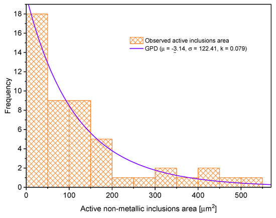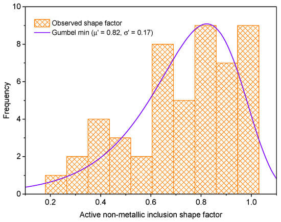 Inclusions that encouraged pit nucleation are named “active inclusions”. Figure 12 and Figure 13 show histograms for active inclusion area and their shape factor. The active inclusion area histogram was fitted to the Generalized Pareto distribution (see Equation (3)). The histogram for active inclusion shape factor was fitted to Gumbel’s minimum value distribution represented by Equation (6) [36,37].