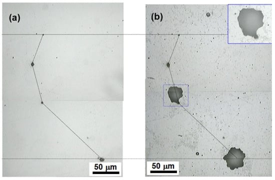 For illustration purposes, as evidence that inclusions tend to generate defects, Figure 14 shows the appearance of a polished API 5L Grade B steel surface (see the inclusions in Figure 14a) and the same steel surface after being subjected to immersion tests (see the holes provoked by the pitting corrosion defects after the immersion test in Figure 14b).