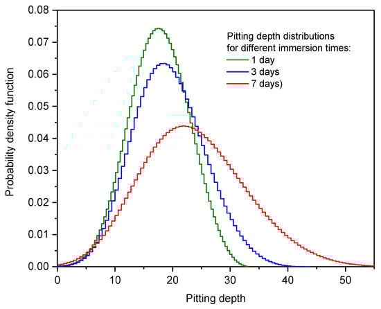 - The Generalized Extreme Value distribution fits adequately for pit depth histograms across mid-term immersion tests (1, 3 and 7 days). The shape parameter of this distribution tends to capture the change in the skewness and kurtosis because of the evolutions of the depth and the emergence of new and shallow pits;
