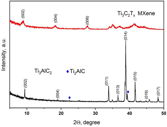 - Naguib, M.; Kurtoglu, M.; Presser, V.; Lu, J.; Niu, J.; Heon, M.; Hultman, L.; Gogotsi, Y.; Barsoum, M.W. Two-dimensional nanocrystals produced by exfoliation of Ti3AlC2. Adv. Mater. 2011, 23, 4248–4253. [Google Scholar] [CrossRef] [PubMed]