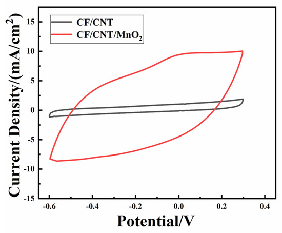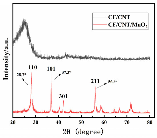 The XRD patterns of the two composites are shown in Figure 3. In the pattern of the modified anode, the position of the peak was observed at around 2θ = 28.7°, 37.3°, and 56.3°, corresponding to the crystal planes of (110), (101), and (211), respectively. The positions of the diffraction peaks are attributed to the standard spectra of standard spinel manganese dioxide (JCPDS 24-0735). As shown in Figure 3, in the pattern of the CF/CNT anode, the diffraction peak could be found at around 2θ = 25.9° due to the characteristic diffraction peak of CNTs.