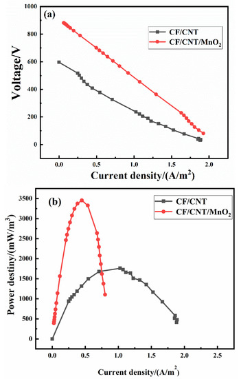Figure 2 shows the SEM pictures of the prepared CF/CNT anode and the CF/CNT/MnO2 composite anode. As shown in Figure 2a, adding CNTs changed the morphology of the CF and formed a network structure on the carbon fiber. As active materials of the conductive network structure, the CNTs had a porous reticular structure, which was conducive to ion transfer in the solution. As seen in Figure 2b, manganese dioxide appeared as agglomerated powder particles, which were tightly packed on CF fibers. The surfaces of the CF fiber and CNTs were uniformly covered by the MnO2 with almost no bare areas. It was shown that the prepared active substances were spherical, and irregular polyhedron manganese dioxide increased the specific surface area of the anode. Moreover, the CF with spherical particles of the CNT/MnO2 composite was prepared, facilitating the adhesion of microorganisms. Thus, the number of microorganisms on the anode surface increased, which further increased the power density of the MFC.