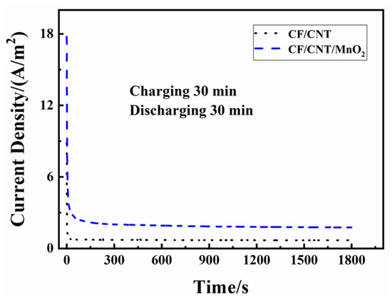 Figure 6 shows the discharge curves of two electrodes at 30 min. As shown in Figure 6, both anodes had a peak current density value (ih) at the initial discharge stage. The peak current density is related to the amount of stored electric quantity. The higher the current density, the more the electric quantity is stored in the charging phase. By comparing the ih values of different anodes in each group of curves, it was found that the ih of the CF/CNT/MnO2 anode was larger than that of the CF/CNT anode. This shows that the energy storage capacity of the anode attached to the pseudo-capacitor and CNT composite material was much higher than that of the CF/CNT anode. After that, the current density gradually tended to have a stable current density (is). The greater the stable current, the better the anode energy storage capacity. Qs is the stored electric quantity, and Qt is the total electric quantity generated.