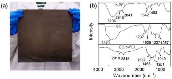 (a) Photograph of GO/b-PEI-coated duplicating paper; (b) FT-IR spectra of b-PEI, GO and GO/b-PEI composite coating.