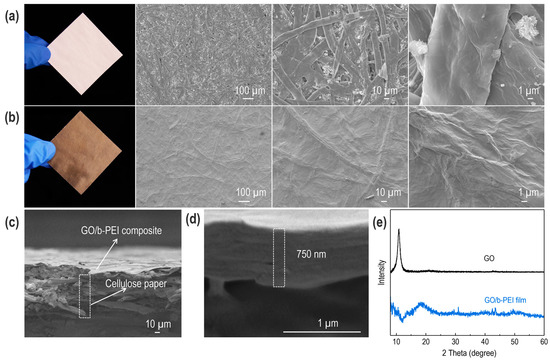 (a) Morphology of copy paper; (b) morphology of GO/b-PEI-coated copy paper; (c) overall cross-section morphology of GO/b-PEI-coated copy paper; (d) magnified morphology SEM image of GO/b-PEI-coated copy paper; (e) XRD pattern of GO power and GO/b-PEI composite film.