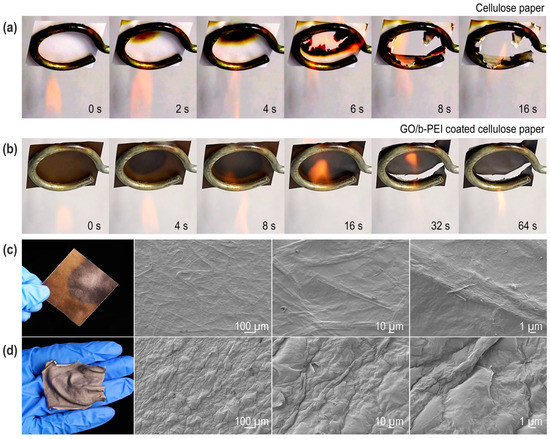 (a,b) Series of photographs showing the combustion process of pristine copy paper and copy paper protected by GO/b-PEI composite coating; a fixed distance of about 7 cm between the alcohol burner and the paper was maintained to ensure direct contact with the outer flame; (c) optical photos and SEM images with various magnifications of GO/b-PEI-coated cellulose paper heated to partial black and (d) full silver gray.