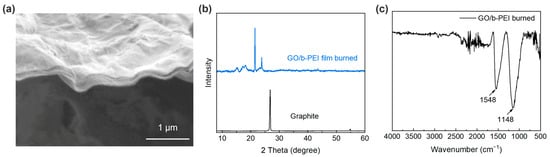 The hypothesis was also supported by the cross-sectional SEM images. As shown in Figure 4a, the decomposition of b-PEI and reduction of GO in GPC also led to a decrease in the thicknesses of the coating and paper, and as a result, the cellulose substrate was not well resolved in the cross-sectional images of the coating post-combustion. The thickness of the silver-gray coating had decreased to ~150 nm. However, the rGO remained tightly stacked, and the cross-sections of GO changed from being relatively straight to a wavy. The structural evolution of the GO/b-PEI composite was also confirmed by XRD and FT-IR spectra. As shown in Figure 4b, the characteristic peak of GO shifted from 10.9° to 21.5° and 23.8°, where the higher angles were closer to those seen in graphite (26°). In the FT-IR spectra (Figure 4c) of GO/b-PEI heated and turned to silver gray, the peaks at 2919 cm−1 and 2815 cm−1 of –CH2– groups and at 1281 cm−1 of C–N groups from the polymer chains had disappeared, indicating the decomposition of b-PEI. The remained peak at 1548 cm−1 corresponded to the stretching vibration of C=C, which came from the restoration of benzyl rings on reduced GO sheets. The peak of C–O–C (ethers) stretching vibration shifted from 1057 cm−1 to 1148 cm−1, which implies structural changes in the GO sheets after heating [20,30,35].
