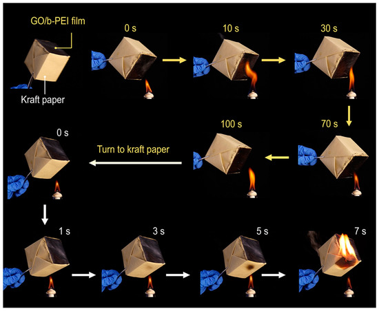 In order to verify the universality of the flame-retardant performance of the GO/b-PEI coating, similar flame tests were performed on kraft paper coated with GO/b-PEI. In these tests, the GPC-kraft paper was first folded into a packaging box and then continuously heated with a flame. As shown in Figure 5, the untreated kraft paper ignited and burned within 7 s, while there was no obvious ignition after 100 s in the region over the box covered with the GO/b-PEI coating.