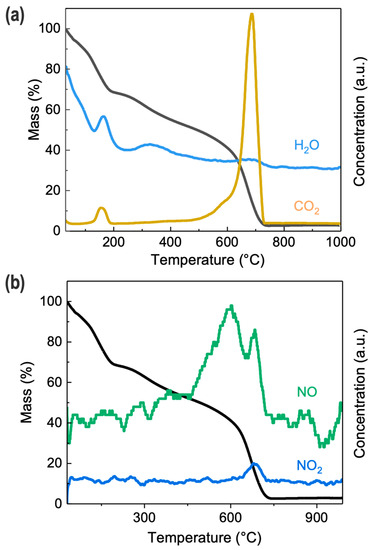TGA-MS spectra of GO/b-PEI composite film. The black curve is the TGA plot, whereas the MS spectra of water vapor and carbon dioxide gases (a) and nitric oxide and nitrogen dioxide (b) are in other colors.