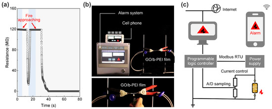 (a) The resistance–time curve of GO/b-PEI-coated cardboard (2 cm × 2 cm in size) when exposed to fire; the blue area denotes no flame applied, while the gray area represents flame applied. (b) Photograph of the fire alarm testing device built in the lab; the distance between the heat source, a lighter, and the sample was approximately 1 cm. (c) Schematic illustration of the wireless-based integrated circuit of fire-alarm system.